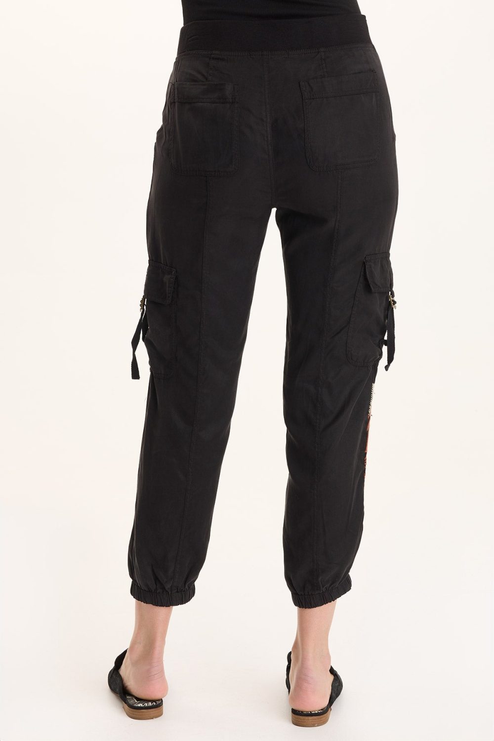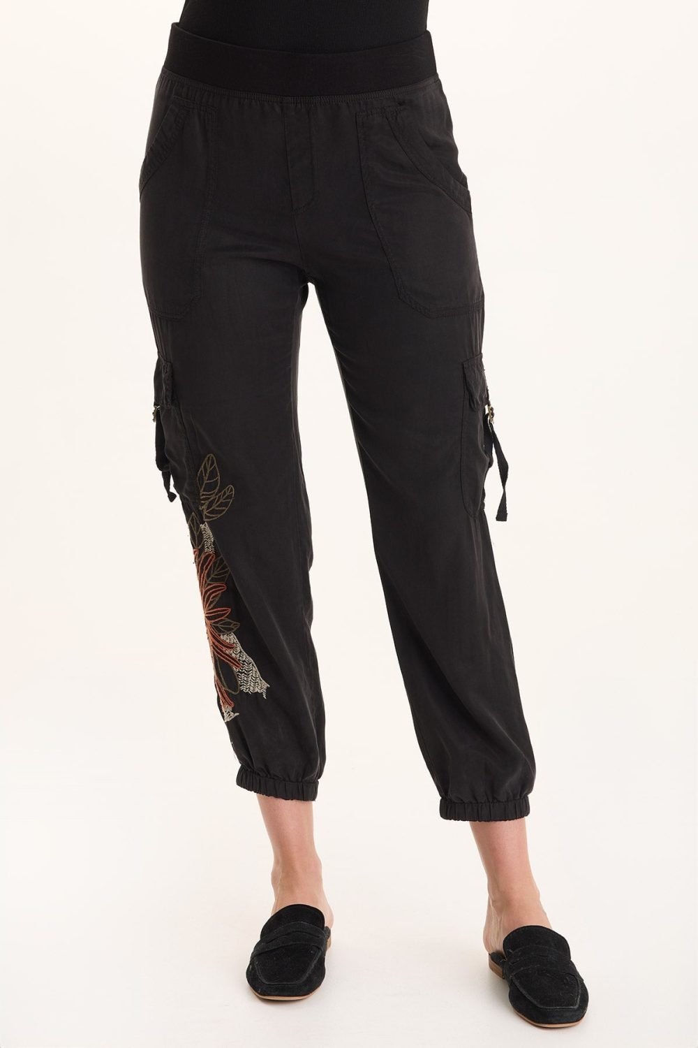 A pull-on faux fly style with tabbed cargo pockets on either side, deep hip pockets, and traditional jogger banding at the cuff, Darri gets an unexpected artisan touch with contrasting floral embroidery detail on the leg.