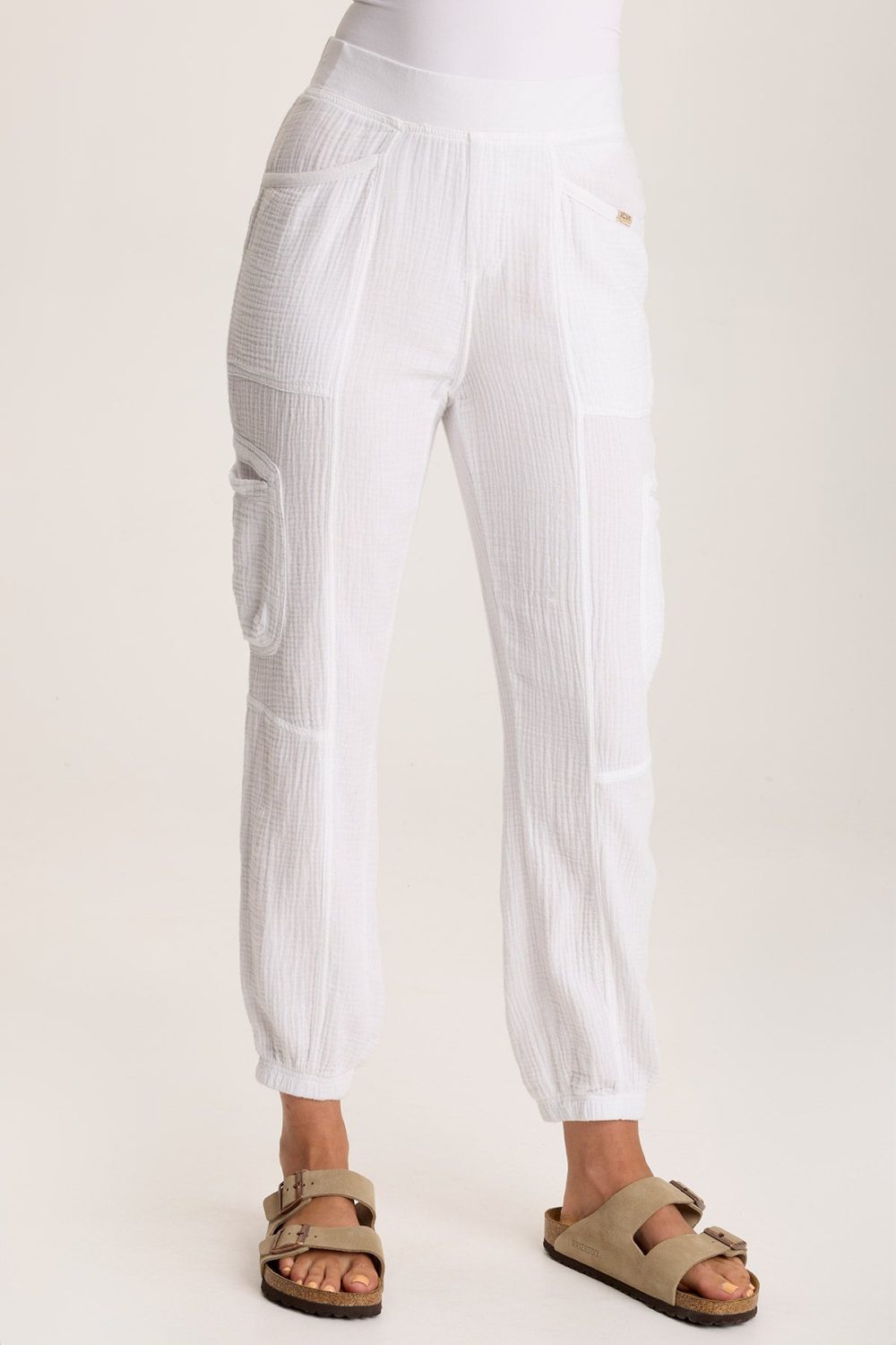 A tapered and cropped jogger-inspired silhouette, elastic pull-on waist, and multiple pockets mix the beachy-casual look with sport influence.