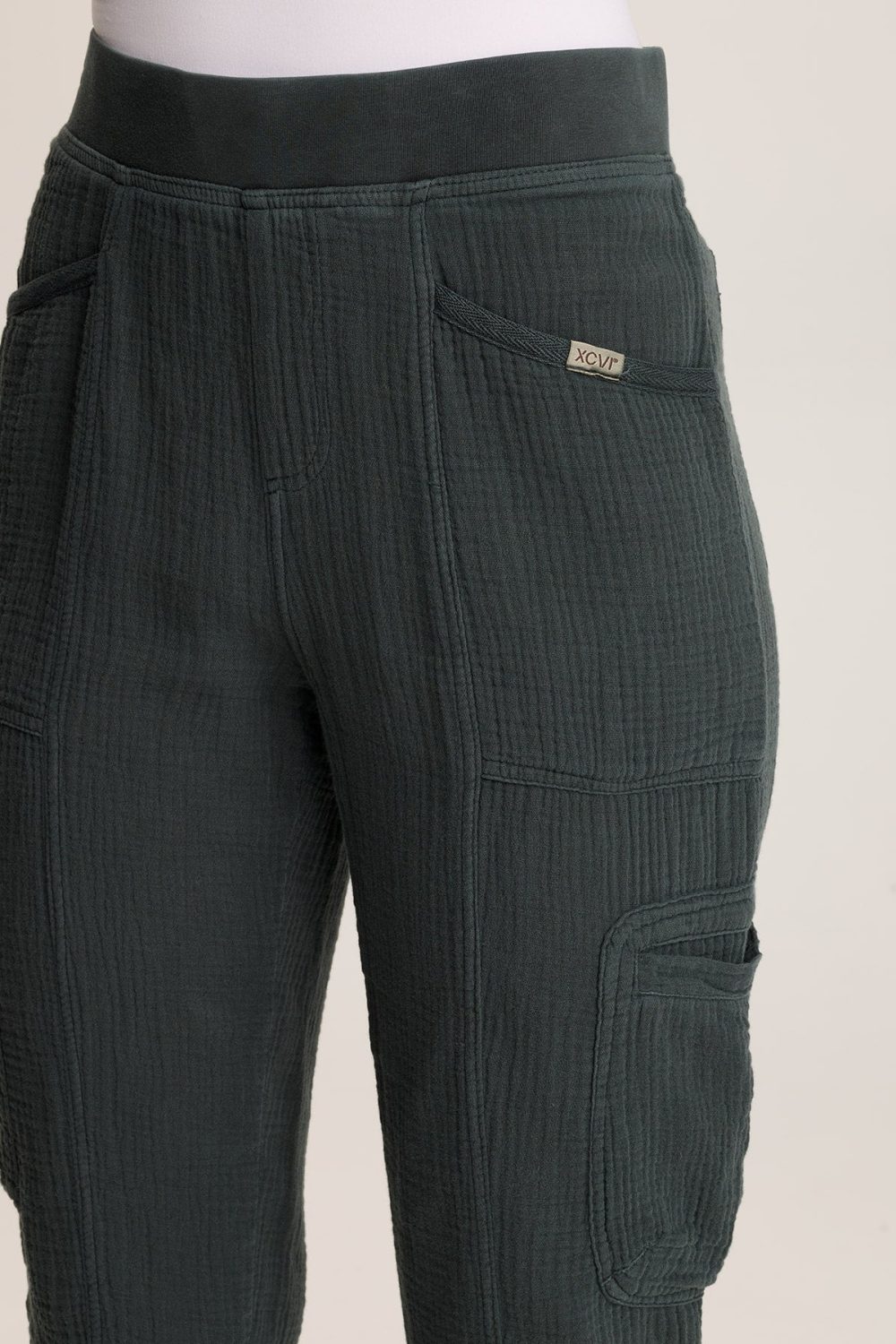 A tapered and cropped jogger-inspired silhouette, elastic pull-on waist, and multiple pockets mix the beachy-casual look with sport influence.